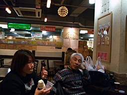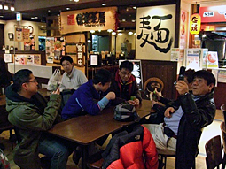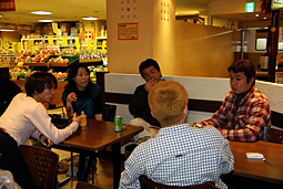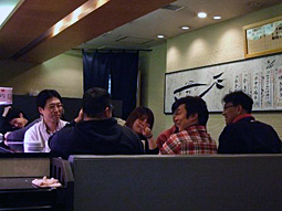 その後、一行はBIGFUN内の回転寿司店へ移動しました。 ここでは、3つのテーブルにこそ分かれてしまいましたが、夕刻の食事時に 幸運にも全員同時に席に着くことができ、皆さん思いおもいにお好みのネタ を堪能しながら話しに華を咲かせていました。 そして今回、回転すし初体験 のみーきさんは、はじめのうちは多少戸惑い ながらも無事に(!?)デビューを飾っていただきました(笑) |