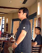 自己紹介中の「さのかずさん」。 肩まで汗びっしょりです。 |