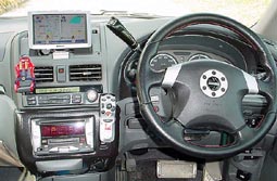 純正オプションのMOMOステアリングと運転席周りです。 メーターパネルとオーディオ周りのパネルをカッティングシ ートでカーボン調にしました。 |