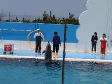 マリンピア日本海のイルカショー Kくん登場 そして大勢の皆様の前で一言、 「初体験で気持ちよかったです!!」 |