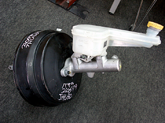 同じく比較用&最終的にシリンダーの部品取りとして入手したGT−Rの マスターバックとシリンダー。見ての通り、明らかにシリンダーの径が 違いますが、GT−Rのように最初から4POTの大きいキャリパーが 入っている車は最初からこの大きいサイズのシリンダーが使われています。 径はいわゆる片持ちの標準キャリパー仕様に使われるサイズが25.4φ。 大型のキャリパー搭載車に使われるサイズが26.9φで、一回り大きい 径になります。 |