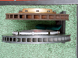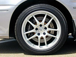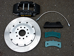キャリパー&ローター キャリパーとローターを一緒に置いてみました。 キャリパーは長さが何と280oもあります。 (参考:Outlowは230o) この大きさは純正のローター径とほぼ同じ大きさですが、 重さはこんな巨大なのにも関わらずアルミ鍛造製なので、 何と3kgしかありません。これは純正キャリパーの半分、 Outlowより700g重たいだけです。 ローターはインチ換算すると14インチという巨大さで、 8kgの重量がありますが、ベルハウジング部が非常に 軽量の為、純正より1kg弱しか変わりはありません。 バネ下に装着されるパーツだけにこの軽さが大きく モノを言います。 |