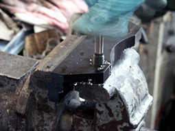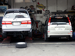 ブラケット加工 BNR−32用のキットを流用しているため、 ブラケットの取付けボルトの径がプレと合わないので、 タッピングにより径を拡大しています。 (BNR−32:12φ → プレ:14φ) 何でもありの加工はチューンショップならではです。 |