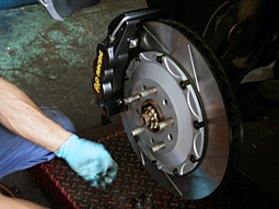 エア抜き作業 キットの取り付けが完了し、ブレーキフルードを 入れなおして、フルードのエア抜き作業を行って いるところです。ここが中途半端だとブレーキの 効きが甘くなったり最悪、効かなくなるという ことがあるので、大事な作業です。 |