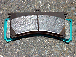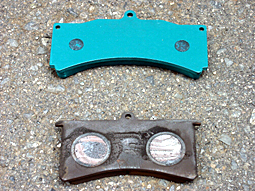 パッド比較@ ブレーキパッドを並べて比較してみました。 上がAP(ルービックス製)、下がOutlow (PFC製)です。明らかにAP用が1回り以上 大きいです。 |