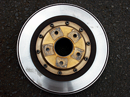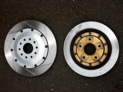 ローター比較@ ローターを並べて比較してみました。 左:AP、右:Outlowです。 1インチUPなので、純正とOutlowを比較したとき (2インチUP)ほどのインパクトはありませんが、 ローターを固定しているベルハウジングの圧倒的な 大きさがAPのただならぬ素性をよく表しています。 |