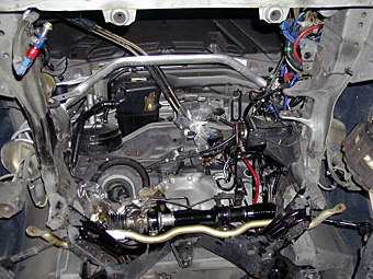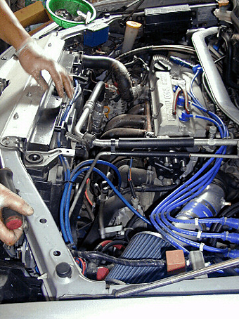 AT側の取付状況です。 写真左真中付近にGT−RSタービン。右上のINマニ 周辺にスロットルボディ(KA24用改)が見えます。 INマニの上に新たに取り付けられている物体が新しい AACバルブ。しかし前述のように制御を行うデータが ありませんので、V−Proで作り込みを行います。 一見、純正と見紛うばかりに収まって見えますが、 タービンとAACバルブのステーは社長の自作。 他にも切った貼ったの部分がいくつもあります。 |