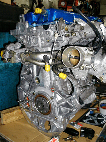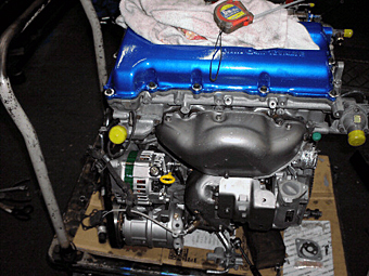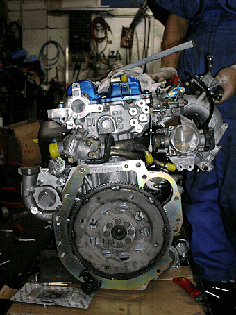 EX側、つまり取付けると正面に当たる側です。 左側にオルターネーターとエアコンプレッサー、 カバーが取付けられたEXマニを挟んで右側に タービンと言う状態になります。 EXマニはまずはエンジンがちゃんと車に載って、 エンジンがかかることが現状では最も重要なことに なりますので、純正をそのまま使用しています。 軽量で高効率の社外品を作るのは後日の課題です。 |