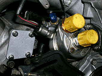 オイル周りとAAC関係の変更に伴う処理です。 オイル関係はオイルクーラーを既に増設しているので、 本来オイルフィルターが付く場所にオイルクーラー用の アタッチメントを装着。defiの油温計センサーも 既にこのアタッチメントに取り付けられています。 左隣の鉄板で塞いだ箇所が元々このエンジンに付いて いたAACバルブの装着箇所。バルブの代わりに鉄板で 塞ぎました。AACの調整用データはこの鉄板の後ろ。 INマニの下にあるパイピングから取得を行います。 |