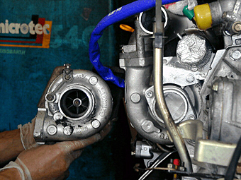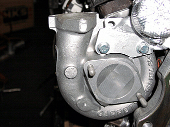 右がGT−RSタービン。左が純正です。 大きさが1回りは優に違います。 問題点の取付の向きが異なるとはこういうこと。 純正は写真のような向きで取付されているのですが、 RSタービンをこの向きで取付けるとエンジンの 配管やラジエータと干渉して装着不能。そこで向きを 90度変えたと言うわけ。たったそれだけと思うかも しれませんが、純正タービンを見てもわかる通り、 実際のステーがくる位置は左上から左にかけての場所。 これを90度向きを変えるとステーも向きを変えた 状態のものが必要になるわけで、一回り大きくなった タービンを限られた空間で各部との干渉を考慮しつつ ステーを作る高度な技術がここに集約されています。 |