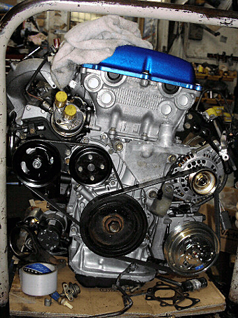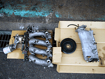 SR20についていたパーツで再利用するものは 洗浄を行った上、再利用します。 これらは灯油とエンジンコンディショナーで綺麗に 洗浄してから使います。特にINマニの左隣にある インジェクションの部分はガソリンを噴霧している 部分だけに入念に洗浄が必要。 右隣のプーリーは滑っては困りますので、この後 パーツクリーナーで油分をよく落とします。 |