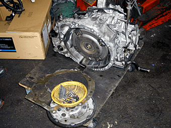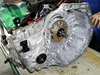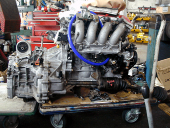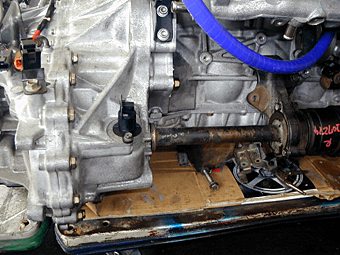 ステーが付けられる見込みになったと言ってそれで 終わりではなく、肝心のドライブシャフトが真っ直ぐに 問題なく取付できなければ何の意味もありません。 そこでATを再強化に出している間にベルハウジングの 交換用として購入したルネッサ用AT(中古)を持って きて稼動及び取付状況をテストを行いました。 |