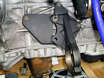 ドライブシャフトとATの接続状況です。 ステーが使えないことで突如、容易ならざる問題として 急浮上した部分ですが、全く問題ないことを確認。 このATとの接合部の下に実はエンジンマウント用の ステーが更に付くのですが、こちらも1箇所穴の位置が 異なるのみで取付可能であることを確認。 配管の取り回しは搭載して状態を見ながらとなります。 |