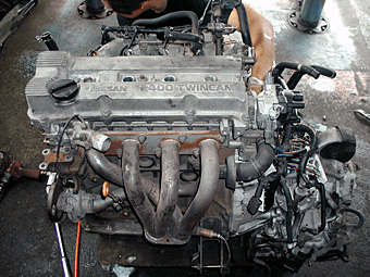 車から降ろされたKA24DEです。 ATをつけたままの状態で降ろしております。 EXマニは社外品ですので実際の形状とは異なります。 ヘッドカバーの部分はアルミブロックですが、 腰下部分(EXマニから下)は黒っぽい色からも判る 通り鋳鉄製です。非常に頑丈ですが重たいエンジンで、 AT分離後に重さを計測した所、何と220kgも ありました。KA24の計測はいくつかの補機類を 外した後で計測であり、EXマニが軽量の社外品に なっていてこの重さですからいわばこれは最低重量。 SR20との重量差はインタークーラーなど追加する 補機類やパイピングの重さを割り引いても、 220kg−140kg=80kgの差と言ってよい かもしれません。換装を行うことにした理由の一つに 「軽量化」がありましたが大きな期待を持てそうです。 |