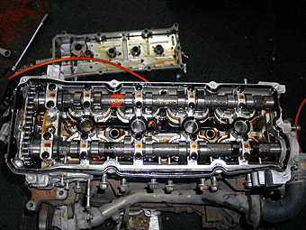 KA24にお別れをする前に14万キロ超の走行を 経たエンジンの状態を見てみようという事で、 ヘッドカバーを外して御開帳。ベットリとオイルが 付着していたりしないか実は結構ドキドキもの。 結果はご覧の通り。恐る恐る蓋を開けるとオイルの 付着が全く無い綺麗な状態で、管理が行き届いていた ことに一安心。未だにレブリミットまで一瞬で回る 元気の良さを見た気がしました。マメにオイル交換を することの大切さを、実際に見て知った気分です。 社長にも完璧な管理状態とお墨付きを頂きました。 開けてみて今まで自分が思い込んでいた間違い発覚。 余りに回らないエンジンなのでトルク重視の8バルブと 思っていましたが、ちゃんと16バルブでした(_ _) 回らないのは余程ロングストロークな為なんですね。 |
