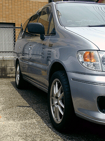 エンジンを降ろし動けない車がピット内に居座っては、 他の作業が何もできなくなってしまうので、ショップの 駐車場に押し出しました。エンジンの他、ラジエータ、 ATなどおよそボンネット内に収まっていた重量物と 言えるものが一切抜き取られてますので、車高が上がって こんな状態に。フロントの車高が上がってハイドロの車 みたいです。車高はノーマルより更に25oUPです。 |