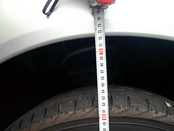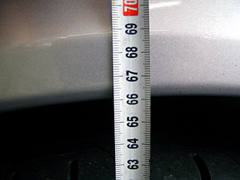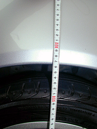 換装後、100km程度走ったところで車高を 計測してみました。結果は接地面よりフェンダーの 最上部まで655o。KA24での計測結果が 650oですから5oUP、つまりフロントの重量が それだけ軽くなったと言うことになります。 実際に走ってみるとフロントが軽くなったとはっきり わかるほど。車高が少し上がって欲しいと言う希望も 沿えた格好です。なお、写真だと斜めに測っている ように見えますが、KA24の計測時と異なり、 自分でメジャーを持ちながら片手で撮影を行った為、 実際にはこれが真っ直ぐです。 |