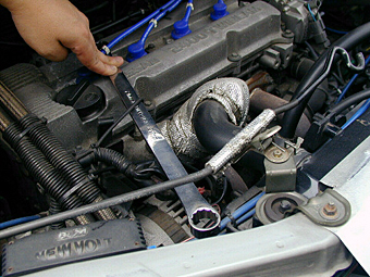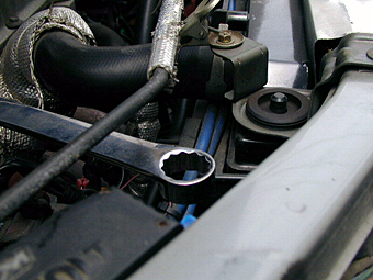 ロングストレートめがねを使っておよその位置を確認。 位置ですがめがねの下、つまりエンジンヘッドと水平の 高さが右にあるラジエータ押さえと丁度同じになります。 これがどのぐらい下の位置にくるか? 30oぐらい下がると、最も車の中で重いパーツで あるだけに挙動や旋回能力も含めてかなり違いが 出るハズです。 |