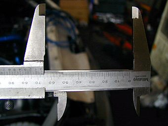 SR22換装後にヘッドの位置を計測しました。 KA24のヘッド位置を計測した時と同様に ヘッドにロングメガネレンチを水平に当てて計測。 KA24はラジエータ押さえと同じ高さでしたが、 写真を見ても判るとおり、明らかに下がっています。 パッと見でも明らかにヘッドの位置が低いのですが、 ノギスを当てて実差を計測。結果は・・・ |