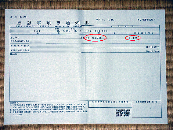 昨年にエンジン換装を行って1年が経過。換装後初の車検を迎えました。 エンジン=原動機は車検証に型式登録されている為、エンジン本体が変わってしまった 現状では車検を通過しません。車検と同時に構造変更の申請を行い、正式に変更認可の 下りた車両、いわゆる「公認」を取得しなければなりませんので、申請を行うことに なりました。 残念ながら車検場で構造変更申請に立ち会うことはできませんでしたが無事認可が下り、 公認取得することができました。 構造変更申請をすること自体が珍しい行為であると思いますので、書類上になりますが 申請前と申請後を比較し、纏めてみました。 車検証(KA24) ![]() U30前期の車検証です。搭載原動機はお馴染みのKA24です。 この時点でかなり普通のプレサージュと違う点がいくつも私のプレにはありましたが、 念のため突起物と見なされる可能性からディフューザーを外して出していた以外は そのままで車検に出しており、このようにきちんと車検証が発行されています。 この時点で車検の際にチェックされていたと思われる項目は ・ディフューザー → 念の為外して申請。そのまま出すとNGだったかは不明 ・チタンマフラー → 排気ガス、音量共に基準値以内 ○ ・ロールケージ → ダッシュ貫通でない為、構造変更不要 ○ ・ローダウン → 最も低い所で10センチ程度のクリアランス有り ○ ・オーバーフェンダー → ギリギリOK。某量販店はNGでしたが・・・ ○ ・ブレーキ → 逆に止まる方向への強化なので全く問題無し ○ ・バッテリー移設 → 取付け位置がマフラーのサブサイレンサーより上 ○ ・シーケンシャル点火 → 点火方式の変更で、原動機自体は変更無し ○ ・ヘッドライトHID化 → HI−LOW切替えを4灯点灯式に変更 ○ この辺りだったと思われますが、前述通りディフューザーを念のため外していた 以外はそのままで普通にDR経由の車検で通過しております。 今回は原動機の型式が変わり原動機の項目だけでなく、排気ガスや車本体の重さも 基準が変わってチェックの対象となりますので、何がどうなっているか判っている 店でなければ申請書類自体が作れない為、ショップ経由で車検と構造変更の申請を 出しております。 車検証(SR20) ![]() 無事申請を通過して発行された車検証です。以前と変わった項目は大きく3ヶ所です。 まずは型式。U30前期の車両型式はGF−U30ですが、構造変更した車両ですので、 U30の後ろに<改>の文字が入り、GF−U30改となっています。 原動機の型式もKA24 → SR20に変わっています。KA24はKA24DE、 SR20ターボはSR20DETとメーカーのカタログなどで表記されていますが、 車検証の原動機型式はあくまでエンジンの型式表記なので、NAでもターボでも一律、 同じ型式表記となります。 2つ目はエンジンの型式変更に伴い車両重量が再計測となっています。 ロールケージなどで重さが増えたものがあるとは言え、逆にエンジンやマフラーなど 純正より大幅に軽くなったものもあるので、新車とトントンと見ておりましたが、 車内の下ろせるものは全て下ろしたにも関わらず、100kgの重量増となっています。 これは新車登録の際の重量はメーカーが机上でパーツの重量を計算して出した値を 運輸局に申請している為(プレサージュと言う車を登録しなければなりませんので)、 いわゆる理論値が通常の車検証には記載された状態で、、実際にはプレサージュクラスの 大きさになると新車でも実測すると100kgぐらい平気で誤差が出るそうです。 車はオーナーが手を入れていくと重くなる傾向にありますから、100kg増にしか ならないのはかなり優秀だそうで、きっちり軽量化もしないと出ない値とのことでした。 実質はすっぴんの新車とトントンと言った所でしょう。 3箇所目は構造変更申請に伴って備考欄の記載項目が大幅に増えています。 変更申請を行う前の状態がどんな状態で、どういった内容の変更項目をどのような検査を 行ったかなどが記載されています。[]で括られた項目がどうやら右下のQRコードでも 見ることができるようになっているようで、括弧の数とQRコードの数が同じ7つです。 登録事項通知書 ![]() 申請した登録事項と相違が無いか確認する為の通知書です。 今回の変更登録申請の主たる理由は「エンジン型式変更に伴う申請」ですから、 車両の型式と原動機の型式の部分が通知書に掲載されています。 車両重量の部分はエンジン型式変更に伴い、再計測が必要となった為、その実測値が 車検証に記載されたと言う二次的な要因ですから、主たる登録事項はこの2つです。 この書類も構造変更申請を行わないとお目にかかれない珍しい書類の一つでしょう。 まとめ 申請でかかった総費用ですが、車検の際に納付する重量税等も含めて約30万円でした。 普通に申請しても15万円前後かかったように思いますので、約2倍の費用がかかった 事になりますが、ディフューザーを装着した状態で正式に認可が下りましたので、 車検に出す際は本当にそ