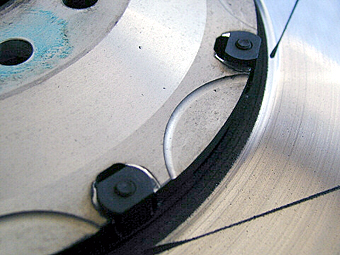 新しいローターを組んだ状態です。 ベルハウジングの青い塗装がちょっと目立ちます。 ローターとハウジングの間に白い部分がありますが、 この部分はパッドが当たらない為、時間と共にここだけ 錆びが発生して汚らしくなってしまいます。 APより若干ベルハウジングの径が小さい分をカバーする 意味で施された処置だと思われます。 |