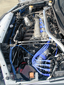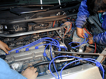 角度を変えて撮影したメカニズムの写真です。 将来的にはエアフロも使えなくなるので、エアフロも これを機に潔く取っ払いました。ディストリビュータの プラグコード用の穴はシリコンで塞いであります。 通常の車はこのディストリビュータで点火や昇圧と言った 全ての点火に関する作業を行うわけですが、構造が単純化 できてコストも押さえられる優れたメリットを持った一方で、 4気筒なら4気筒分、6気筒なら6気筒分の負荷がここに 集中する為、熱を持ちやすく、効率の面でロスを生じたり、 より強力な電圧を長時間かけたくても限界が低いなどの 弱点もあります。(パソコンのメモリーが512MB×1 よりも256MB×2の方が処理速度や効率が高いのと 理屈はほぼ同じと考えて頂ければと思います。) そこでレースの車両ではコンピュータにより4気筒なら 4気筒分を全て独立させて制御し、負荷分散を図ると同時に 点火効率を飛躍的に高めるシーケンシャル点火方式を使って いるわけです。実際に走ってみて確実にパワー・トルクとも 以前よりUPをしていると思います。 |