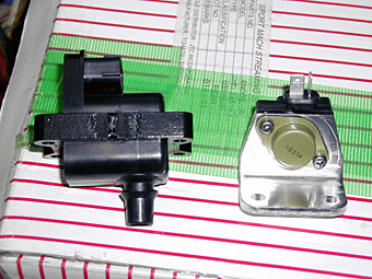 使用するイグナイターとコイルです。 RB26DETT用。つまりGT−Rの心臓に使われて いるものと全く同じ物です。GT−Rの心臓に使われて いるだけあってあらゆるイグナイター、コイルの中で 最もタフで高い放電に耐える設計になっているそうです。 KA24は4気筒ですのでプラグコード1本につき、 この2つが1セットで合計4セット必要になります。 |