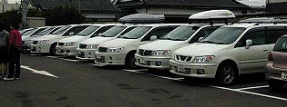 2日目の松島観光に出発するため、集まった7台。 前日とはグズついた天気とはうって変わって素晴ら しい快晴でした。 |