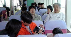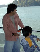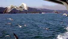 餌のかっぱえびせん目当てにやってくるかもめにえびせんを あげているメンバー一同。うまいかもめは投げると空中で キャッチしていきます。 ![]() |