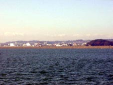 松島湾からの塩釜の遠景です。 手前の海に見える柱の数々は特産品の牡蠣の養殖場です。 |