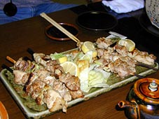 まずは出てきた大きさにビックリ!写真に写っている箸と 大きさを比べればわかりますが、普通の焼き鳥の倍はあります。 秋田の地鶏(ひょっとして比内鶏?)だそうでジューシーです。 |