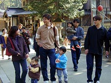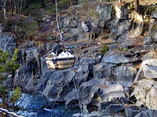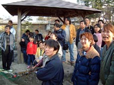 団子がこちらに送られるのを面白がって見つめるメンバーと 居合せた観光客。職人芸と言うか対岸ですごいスピードで 縄さばき?をしているのが見ていて本当に笑えます。 |