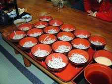 これが岩手県名物のわんこそばです。 これは18杯までであくまで雰囲気を楽しむだけですが、 実際の早食い大会では無制限に出てきます。 麺が太めで以外と食いづらそうな感じでしたが…。 |