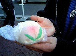 お昼を食べに行った中華街で怪しい饅頭を見つけて しまいました。その名も『桃マン』。 購入したチャレンジャーは小島@OBさんです。 何か桃の形に似せてほんのりピンクに染めてある 辺りが色々な想像をかきたてる一品ですが(笑) 中身は白あんで小島@OBさんが言うには、 お味の方は「何かイマイチ」とのこと。 これはウケ狙いの饅頭ナノカ? |
