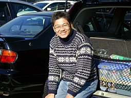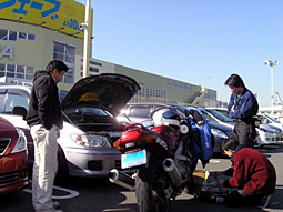 いつもは家族をつれてラフェスタで参加してますが、 今回は単身参加という事で、身軽な単車で参加した Nobu&Akika@OBさんです。 工具を貸してくれと言うので幹事が車から工具箱を 引っ張り出して準備中です。 |