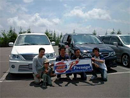 とき・・・平成15年6月15日(父の日)10時から ところ・・十勝インターナショナルスピードウェイ (帯広市の南、十勝管内更別村) この日サーキット主催で開催されるイベント「父の日走行会」に便乗する形で、というよりも 参加したい幹事のわがままにメンバーを付き合わせてしまう形でのオフ会開催となりました。 幹事(寂しく単身)が走行会受付時間の10時少し前に会場に着くと、すでにオフ会初参加 のたかちゃん5.1さん(お仲間と参加)とホクト号さん(奥様と参加)が到着されていました。 挨拶を交わした後走行会の受付をし、しばし談義。 少し遅れて到着のMMさん(ご家族で参加)と4組で、またしばし談義を楽しみました。 たかちゃん5.1さんのプレは自作や小技が盛りだくさんの勉強になるプレでした。 タイヤが少し不安なのでフリー走行は控える、とのことです。 ホクト号さんのプレは車高調でベタベタに落とされ、ボンマスの良く似合うライダーでした。 子供ができてからはマジ走りから少し遠のいている、とのことです。 2台は体験走行(家族を乗せてコース3周、先導車付き、追越禁止)のみの参加でしたが、 MMさんと幹事はヘルメットとグローブ着用のミニバンフリー走行にも参加しました。 体験走行では、幹事が勘違いから隊列に参加せず、せっかくの編隊走行が3台だけ(幹事 は2台を挟んだ後ろから)になってしまいました。申しわけありません。 体験走行のみのお二人も「マジ走り」は嫌いではなかったようで、次の機会を狙っている様 子でした。 体験走行後、集合写真の撮影を行いましたが、はじめての「撮影会」モード。 カメラが5台ほどでメンバーと紙看板を狙うの図にどこを向いてよいやら照れくさいやら。 そうこうしているうちに12時55分からのミニバンフリー走行が始まりました。 先に行われたブリーフィングでは、スタッフから「ミニバンで参加の方、ひっくり返らないよう に」と言われました。ペースカー先導の慣熟走行の後、サンジ号、MM号、ホンダ軍団(ス テップワゴン3台、ストリーム1台)の順でコースイン。 幹事は前車アベニールでサーキット走行を楽しんでいたこともあり、1周目からフルスロッ トルでタイヤ鳴きまくりです。 シフトは「2」と「D」(ODオフ)しか使わず、やはり4速コラムATではサーキット走行に向か ないということを実感。 走行開始早々、サーキット走行初めてのMMさんが2台のホンダ軍団に抜かれてしまいま した。 その2台は2周目にサンジ号におそいかかり、2周目中盤でステップWを、3周目の第1コー ナーでストリームを先に行かせ、無茶・無理をしない作戦に出ました。 その後はプレ2台ともそれぞれのペースで、25分間で10周のサーキット走行を楽しみまし た。 走行終了後、スタンドやピット上から観戦(?)されていたたかちゃん5.1さん一行とホクト 号さん夫妻、MMさんのご家族と、興奮冷めやらぬ中しばし歓談し、それぞれ予定がある ことから13時40分ころ解散となりました。 メールを下さったこいちさん、majinbooさん、たかみつさん、だいパパさん、NORIKO姫 ありがとうございます。 参加された皆様の感想です。 たかちゃん5.1さん 初めてオフ会に参加しました、とても楽しい一日でした。皆様のプレを見て、新しい発見を することが出来て、とてもありがたいと思っています。 私とホクト号さんは、フリー走行のみでしたが、プレサンジさんとMMさんが本気(まじ)走り をみて、感動しました。もし また このような走行会があるのならば、私もまじ走りすると、心 に誓いました、そのためにもタイヤ買っときます。 またオフ会参加出来たら参加いたします。 幹事プレサンジさん MMさん ホクト号さん また会いましょう ホクト号さん 十勝走行会オフ会ご参加の皆様、大変お疲れ様でした。 オフ会初参加で少し不安でしたが、すぐに溶け込めることが出来一安心。 天候も晴天に恵まれ、サーキット3周の体験走行に参加し楽しかったです。 皆さんと別れた後、18:35に着きました。フロントバンパーは虫だらけで大変なことに・・・ 明日洗車しよっと 本当に今回参加してよかったです。 また、どこかのオフ会でお会いしましょう。 MMさん いつものオフ会とはちょっと違った趣向のオフ会でしたね。 私の場合、やはりミニバンフリー走行の25分間、実に楽しかったです。 スタート前は、たかみつさんお察しのとおり、心臓バクバクでした。 スタートしだすと手に汗、ヘルメット内も汗でした。 初体験ということもあり、最初の2〜3週は、要領が得られず、次第になれてきたかなというと こです。 う〜ん、エンジン、タイヤ、タワーバー、軽量化などが頭の中をよぎりながら、走行していまし た。 最後は、腕かと変に納得したMMでしたが・・・。 本当、これは記念に残りますね。 プレサンジ さん 「十勝走行会オフ会」に参加された皆さん、ご苦労様でした。 前日には雨が降ったりと天気が心配でしたが、今日は天気もよく、暖かい(長袖だと暑かっ た)オフ会日和でした。 とにかく